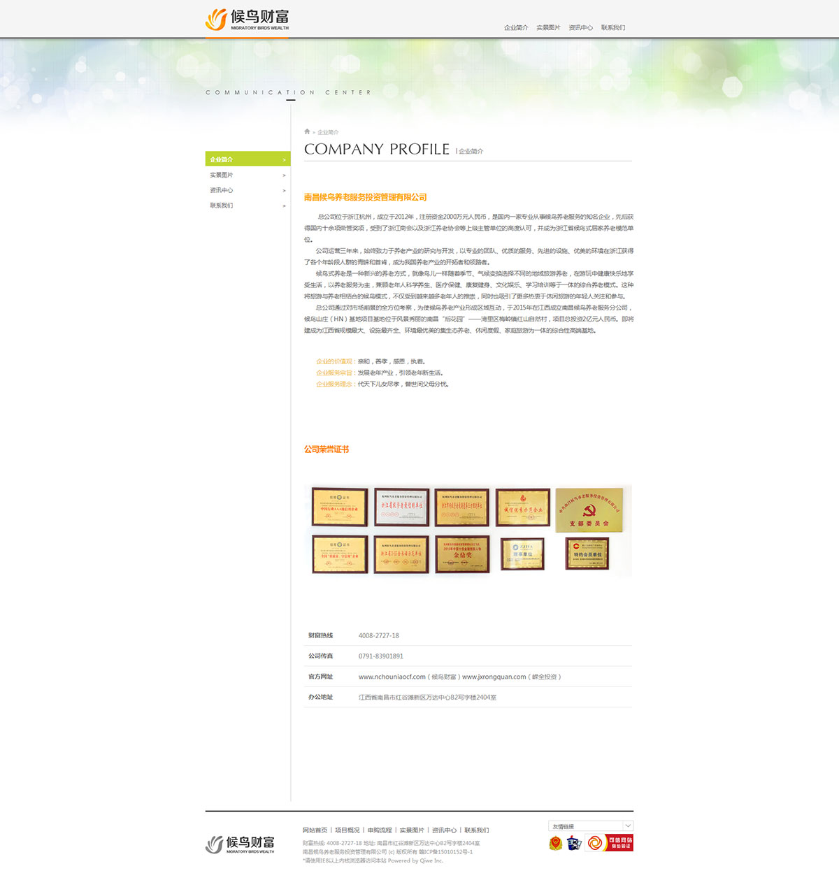 总公司位于浙江杭州,成立于2012年,注册资金2000万元人民币,是国内一家专业从事候鸟养老服务的知名企业,先后获得国内十余项荣誉奖项,受到了浙江商会以及浙江养老协会等上级主管单位的高度认可,并成为浙江省候鸟式居家养老模范单位。